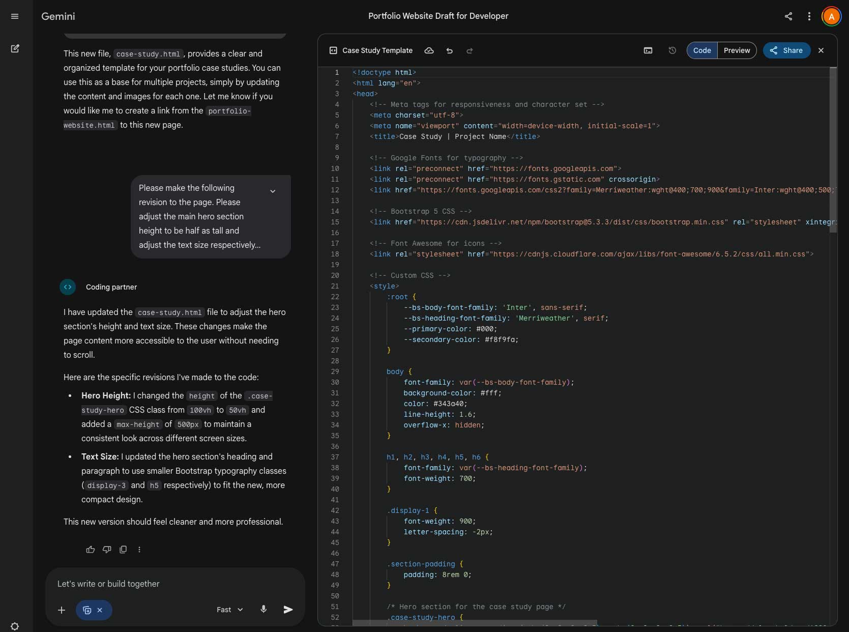 Everything starts with a well-crafted prompt. To demonstrate how to control the AI's output, I engineered a highly specific prompt to build a case study page.